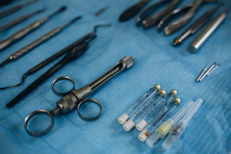 A collection of surgical instruments meticulously arranged on a blue cloth surface captures the essence of medical precision and professionalism in healthcare settings.