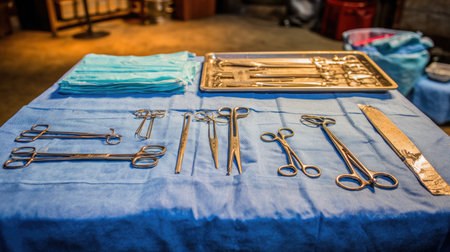 A meticulously arranged set of sterile surgical instruments lies ready on a blue drape, awaiting the start of a critical medical procedure. This scene captures the precision, preparation, and gravity of the operating room environment, symbolizing the intersection of technology and human skill in modern healthcare.