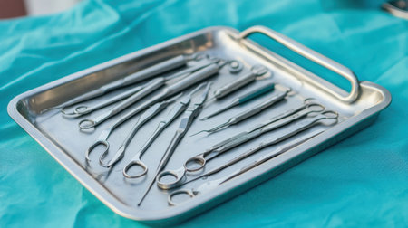 A collection of surgical tools is beautifully arranged on a stainless steel tray, reflecting a sterile and organized environment typical of a medical operating room.