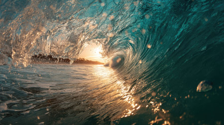 An ocean wave curves and crashes, displaying vibrant blue and turquoise hues. The dynamic composition captures water movement with intricate textures, lit by golden sunlight. This image could serve various purposes, from illustrating environmental themes to use in advertising and design projects.
