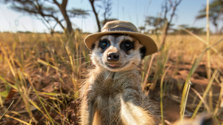 Curious meerkat wearing a safari hat in a sunlit African savanna, with tall grass and acacia trees in the background.