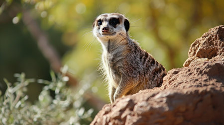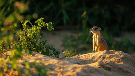 A charming meerkat stands alert on a sandy mound, bathed in soft golden light. The backdrop features vibrant greenery, contributing to a serene and natural environment.