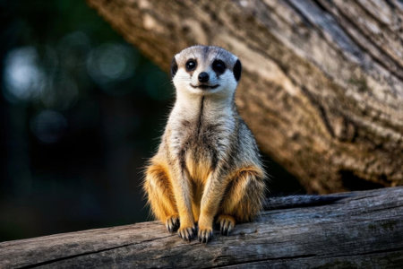 A shot of the meerkat sitting on a trunk of a tree with its hindfoot