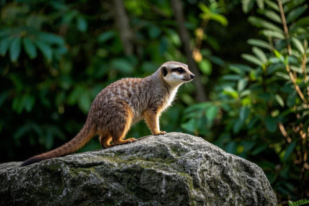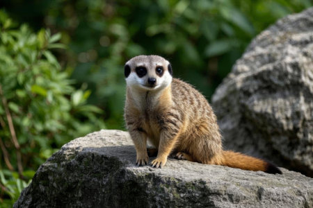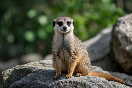 Watchful meerkat on a rock in front of a green, blurred background - perfect symbol for attention, nature and wildlife observation.