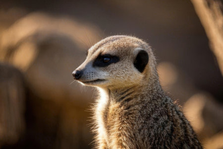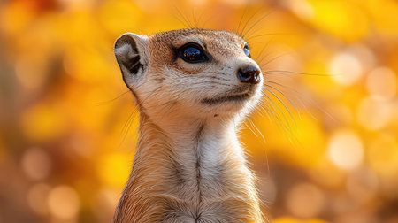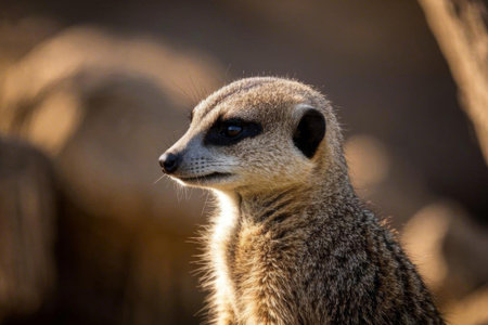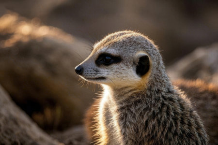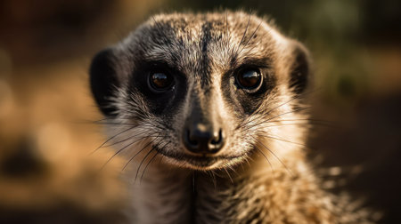 A charming close-up of a meerkat with soft fur, bright eyes, and an inquisitive expression. The warm background enhances the delightful and playful nature of this adorable animal.