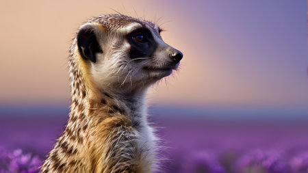 Meerkat standing on a lavender field and looking at the camera. generated by AI