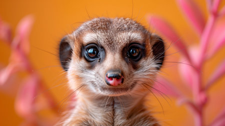 Close Up Portrait of a Meerkat With Pink Plant in Background