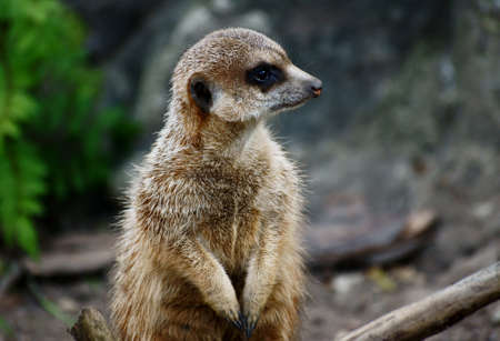 Young meerkat with a nose stained with mud, raised his neck and head to look around, closeup
