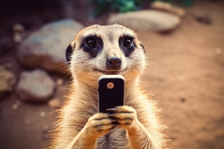 Meerkat wild animal making a selfie with smartphone illustration generative ai