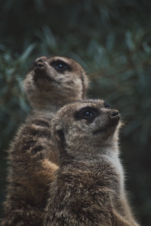 Two curiosity Meerkats (Suricata suricatta) or African small carnivores watching surroundings.