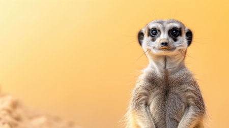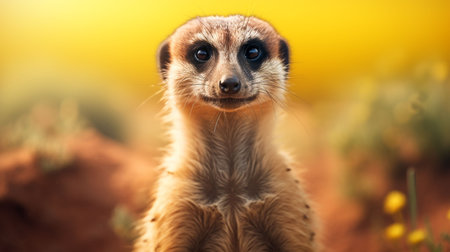 a single baby meerkat stands in front of a vibrant yellow background, showcasing a minimalistic portrait style. the photograph captures the meerkat's adorable presence with saturated colors and a large format lens. the image portrays a humorous animal scene, offering an exotic and close-up view of the meerkat. the composition is symmetrical, adding to the visual appeal. ai generated