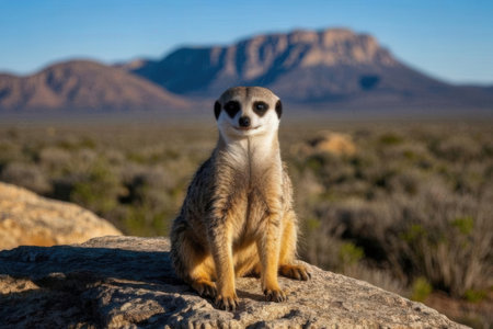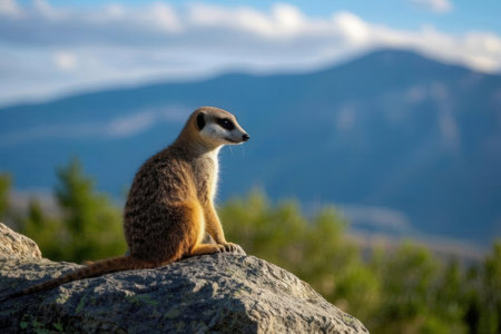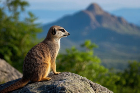 Meerkat sitting on a rock in front of a mountain in Africa