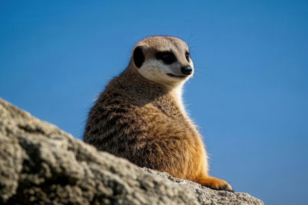 Meerkat sitting on a rock with blue sky in the background