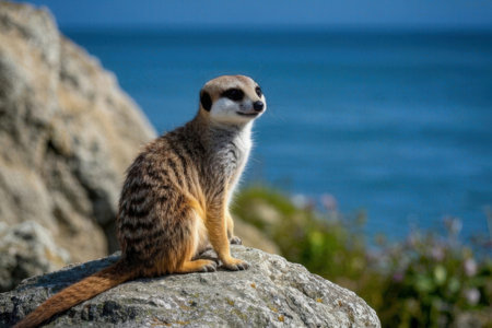 Meerkat sitting on a rock by the sea, Cape Town, South Africa