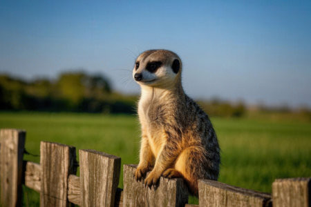 Meerkat sitting on a fence in a meadow looking ahead