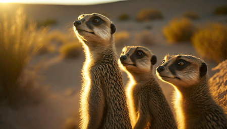 An AI generated illustration of meerkats standing in a sandy desert landscape