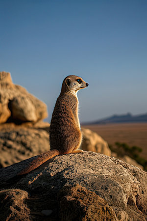 A curious meerkat stands tall and alert in the African grasslands, surrounded by stunning natural scenery. This captivating scene captures the essence of wildlife in its habitat.