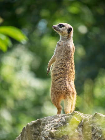 Single Meerkat standing on the rock and watching. Suricata suricatta or Suricate on the look out. Blurred background of surranding trees.