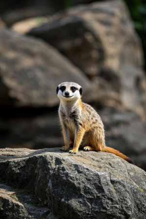 Close up of a meerkat sitting on a rock