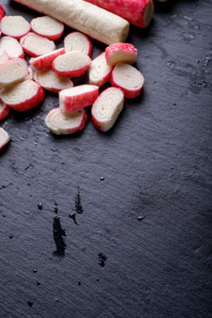 Delicious, fresh crab sticks shot on a blackboard in the studio.