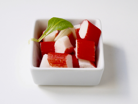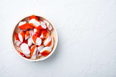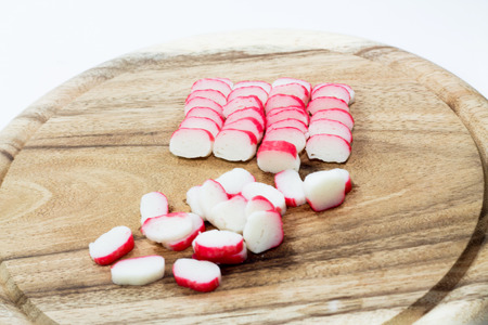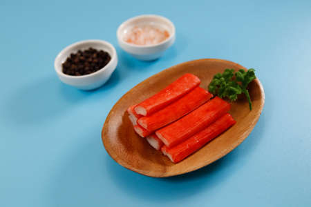 Fresh Crab meat stick surimi set, on wooden tray, on white background