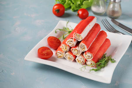 Crab sticks stuffed with cod liver and eggs, traditional festive Russian snack in a plate on a light blue background, Space for text