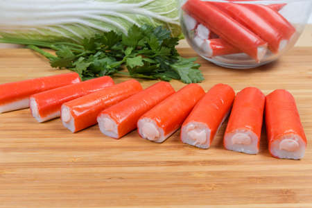 Crab sticks stuffed with processed cheese spread on the wooden bamboo cutting board and in glass bowl among of greens and vegetables close-up at selective focus