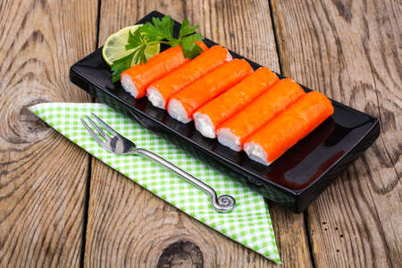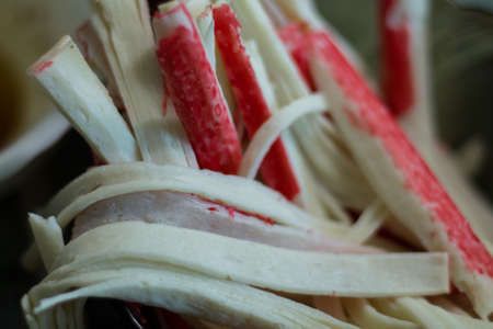 Crab sticks cut into strips for making sushi. Homemade sushi. Culinary background.