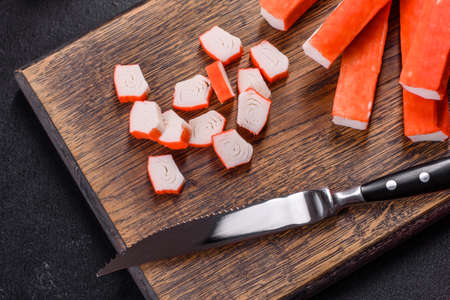 Sliced crab sticks on a cutting Board with a knife. On black rustic background