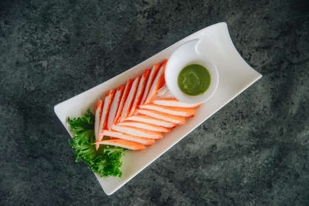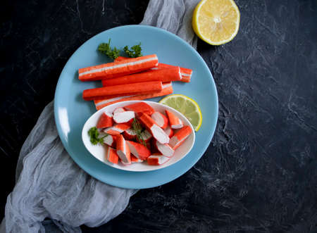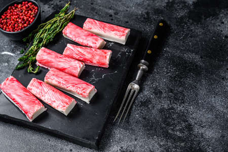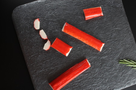 Fresh Crab meat stick surimi set, on stone board, on black background, top view flat lay