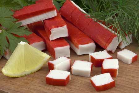 Crab Sticks with Slices of Lemon and Parsley on Wooden Background