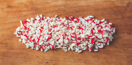 finely chopped crab sticks on cutting board. close up, top view, toned photo