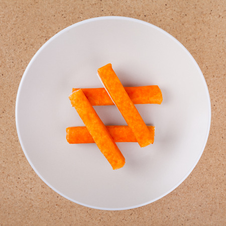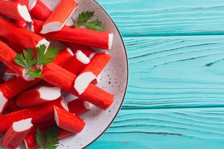 Ceramic plate with crab sticks on rustic wooden table. Top view