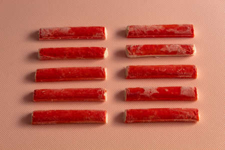 The horizontal image with a pink background shows food. It's crab sticks. Each stick is packed separately. Sticks of only ten pieces