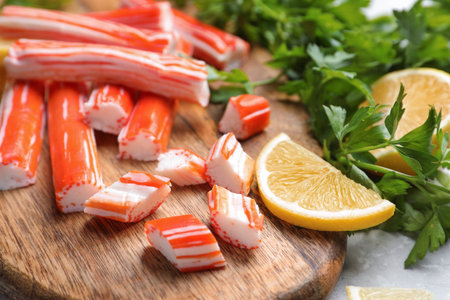 Delicious crab sticks with lemon and parsley on wooden board, closeup