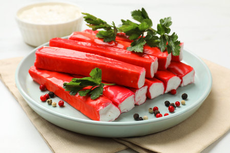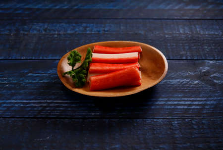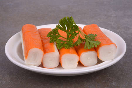 Surimi sticks in a saucer with a sprig of parsley close-up on a gray background