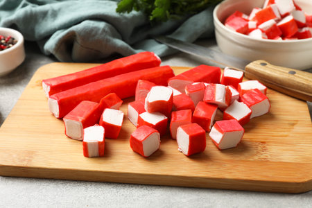 Sliced crab sticks and knife on wooden cutting board, closeup