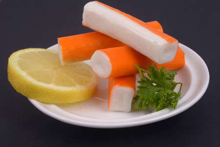 Surimi sticks in a saucer with a slice of lemon and a sprig of parsley close-up on a black background