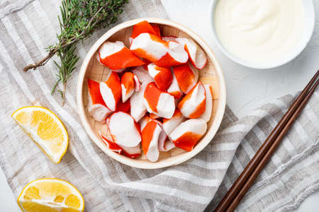 Fresh Crab meat stick surimi set, on wooden cutting board, on gray background, top view flat lay