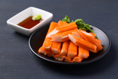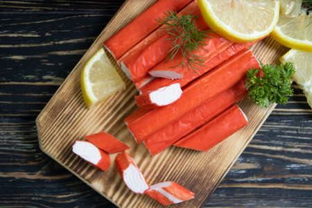 Crab sticks on a cutting Board with greens, sauce and garlic. On dark rustic background