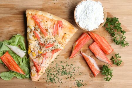 In the horizontal photo, crab sticks are lying on an old wooden table. Crab sticks for making salad. Products are shown in close-up