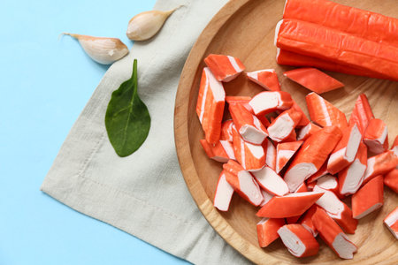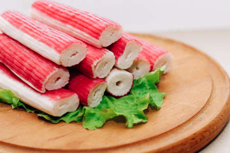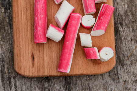Crab sticks on cutting board on rustic wooden table on a light green wooden background.