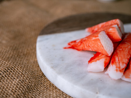 Crab surimi sticks on marble board. Black background. Top view. Copy space
