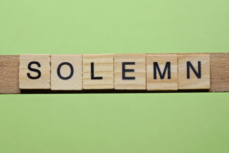 word solemn made of small gray wooden letters on a green background