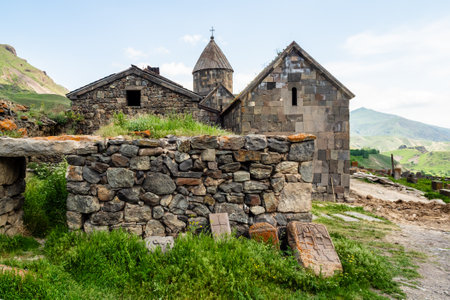 Ancient Armenian monastery architecture with stone walls and church tower