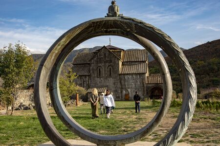 Armenia, Akhtala, October 2019. a stone sculpture symbolizing the engagement rings, one can see people walking towards the temple, standing against the backdrop of autumn mountains.