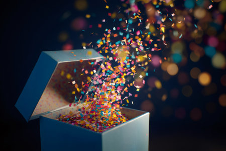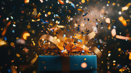 Confetti and ribbons burst from an open gift box, creating a vibrant display against a contrasting dark backdrop, perfect for celebrations.
