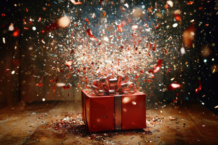 An open gift box releases a burst of colorful confetti and ribbons, adding excitement to a festive occasion and enhancing the celebration atmosphere.