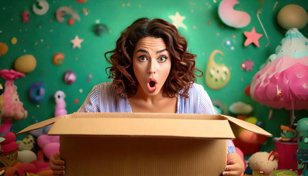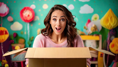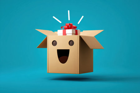 A cheerful cardboard box flips open to reveal a surprise gift adorned with a ribbon, radiating joy and excitement in a vibrant setting.