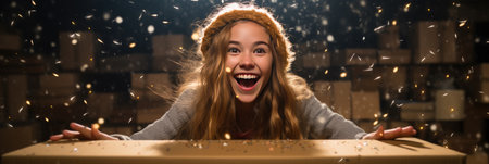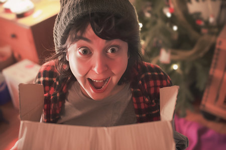 A happy child with curly hair expresses pure joy while opening a box in a warmly decorated room, capturing the magic of surprise and festive spirit.